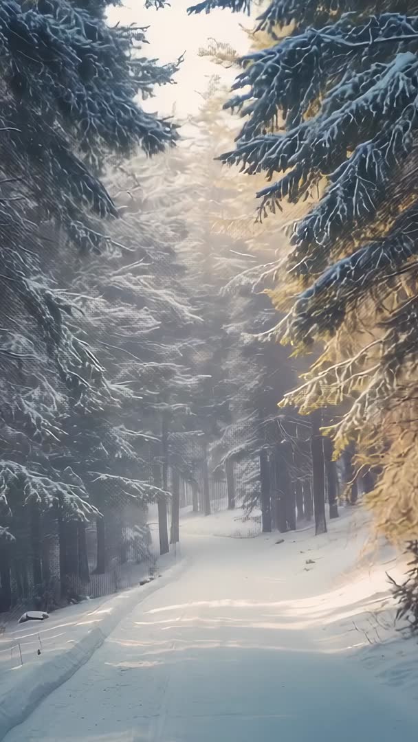 AI Generated Video. Camera moving forward along snow-covered trail between towering pine trees, revealing misty distance and sunlight filtering through canopy. Sunlight drawing warm golden beams across frosted branches and compacted track, creating contrast between warm highlights and cool blue shadows. Scene evoking calm, solitude, winter wilderness mood, perfect for cinematic b-roll and ambient backgrounds. Useful for social media vertical reels, mobile wallpaper, travel or adventure promos, holiday greetings, wellness and meditation content, background for nature documentaries, seasonal commercials. Editing suggestions: using slow push-in, gentle color grade emphasizing warm highlights, adding ambient piano or wind sound, looping middle section for seamless background, placing text or logo in upper or lower safe zones for overlays. Footage working well for stock libraries, title sequences, app intros, or scenic transitions.