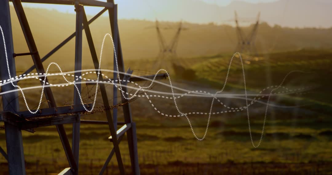 - Sunlight rising with animated waveform sweeping across power transmission towers at golden hour