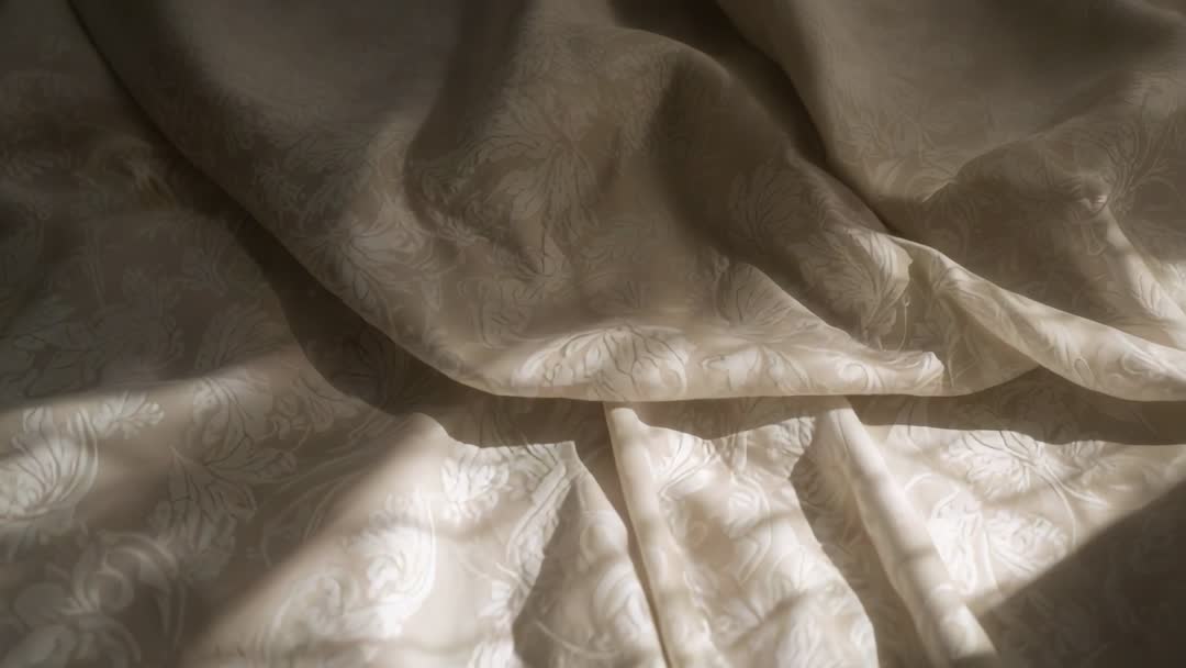 - Sunlight Shifting Across Cream Damask Duvet Fabric Folds in Slow Morning Motion