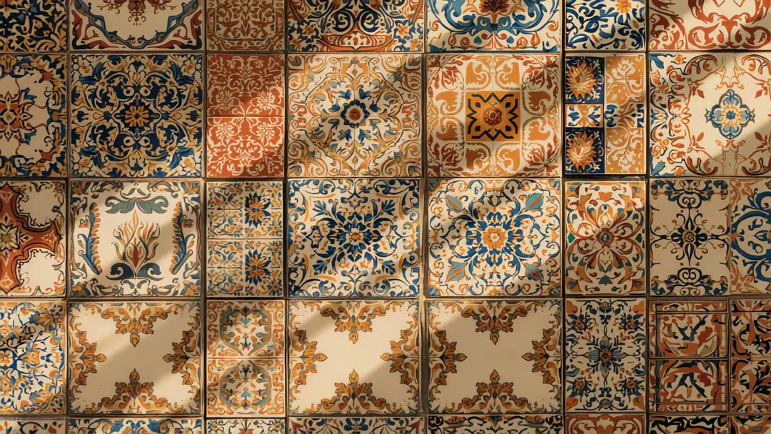 AI Generated Image. Sunlight shifting across ornate ceramic tile mosaic, casting warm, dappled shadows and revealing hand-painted floral medallions and arabesque rosettes. Color palette featuring deep blue, warm ochre, terracotta and cream, creating Mediterranean mood. Close-up grid composition highlighting texture, grout lines and subtle surface reflections. Suiting background loops, title overlays, social media reels, architecture and interior design B-roll, product staging for home decor brands, hospitality marketing for boutique hotels and restaurants. Useful for wallpaper and textile pattern reference, tile restoration tutorials, styling guides and travel videos showcasing Mediterranean or North African influences. Recommended editing: slow parallax or gentle pan, warm color grading enhancing ochre tones, soft vignette emphasizing center. Deliverable ideas: 5-10 second seamless loop, 16:9 and square crops for social platforms, thumbnail still with high-contrast highlight placement.