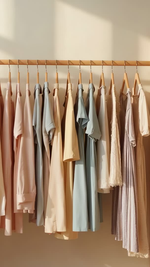 AI Generated Video. Vertical clip capturing warm sunlight sliding across wooden clothing rack lined with pastel dresses, blouses, and lightweight outerwear. Soft shadows creating calm mood and highlighting texture of linen, cotton, and silk. Neutral palette featuring blush, powder blue, beige, and ivory, with gentle movement from slight breeze or camera pan. Slow pan emphasizing interplay of light and fabric, ideal for showing color, cut, and material. Suitable for retail ads, fashion lookbook reels, social media content, boutique promos, and lifestyle branding. Use for online store banners, product showcase videos, mood background for website hero, styling tutorial overlays, or store window campaign. Offering option for color grading to match brand palette and leaving negative space at top for title, logo, or text overlay.