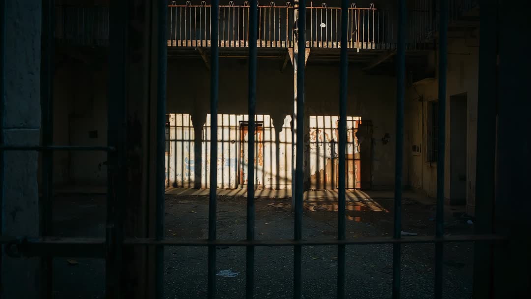 AI Generated Image. Footage capturing sunlight sliding through vertical bars of rusted gate, casting striped shadows across cracked concrete floor and peeling paint on cellblock walls. Showing viewpoint from behind bars, foreground elements creating strong framing and depth while upper walkway silhouettes add layered composition. Mood moody and cinematic, textures emphasizing corrosion, debris, puddles and flaking paint. Suitable for documentary footage about incarceration, urban decay and abandoned architecture; thriller film inserts and establishing clip for crime or suspense scenes; background footage for true crime podcasts, articles and video essays; promotional material for escape rooms, haunted tours and historical restoration projects. Ideal for color grading toward warm golden tones or cold desaturated palette, compatible with slow pan or dolly-in transitions, and usable as loopable ambient background for motion graphics or sound design projects.