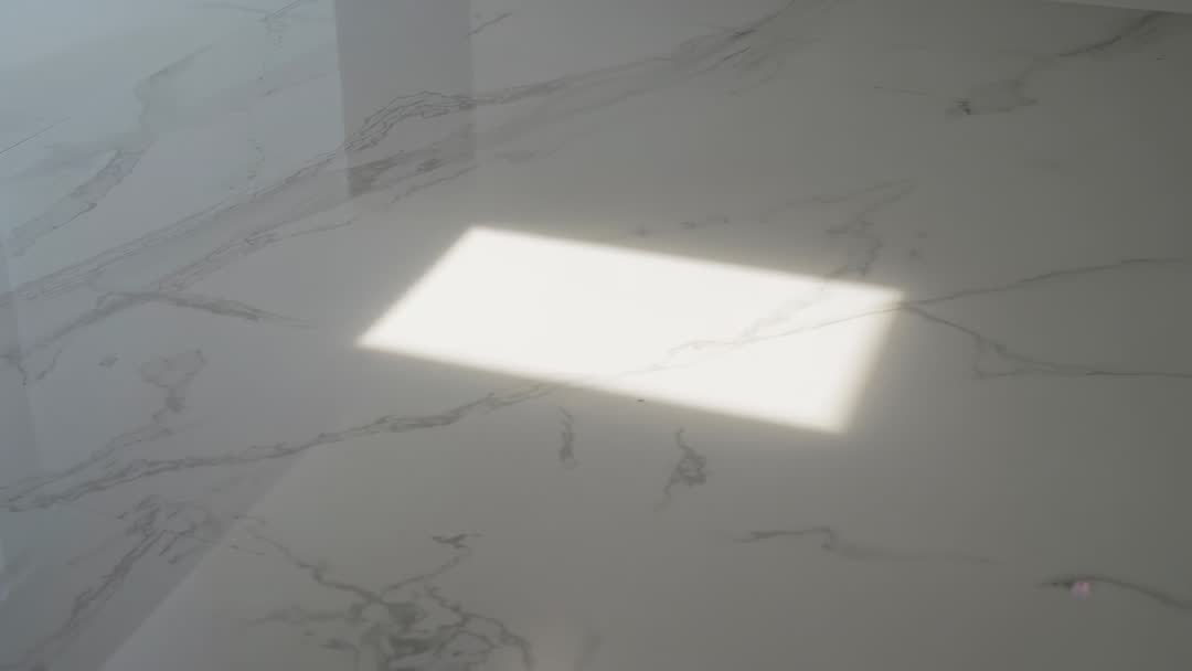 AI Generated Video. Short video clip capturing sunlight streaming across polished marble floor, casting bright rectangular highlight and soft mullion shadow while light sliding slowly across glossy surface. Featuring neutral palette with warm highlight tones and cool gray veining, high-contrast composition and minimal visual elements. Useful for interior design promos, architecture reels, minimalist ads, product mockups, website hero banners, title sequences, TV and social media backgrounds, mood-setting film overlays. Clip working well as loopable background for transitions, overlaying text or logos, and demonstrating material texture or flooring finishes. Ideal for showcasing natural light in modern spaces, luxury finishes, calm atmosphere and cinematic stillness.