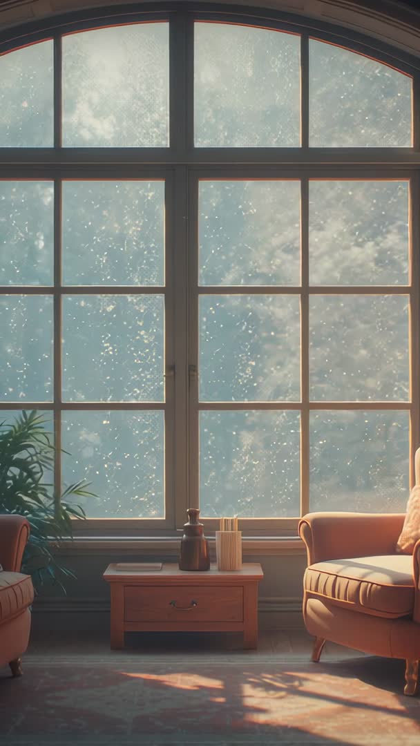AI Generated Image. Vertical video capturing sunlight streaming through tall arched window, dust motes drifting in warm golden beams. Soft shadows moving across vintage armchairs and wooden side table, creating calm, cozy interior mood with cinematic warmth and soft window bokeh. Ideal for wellness and meditation apps, sleep and relaxation content, social media stories and reels, interior design promos, real estate lifestyle clips, and b-roll for film or broadcast. Works well as looping background, slow-motion sequence, or gentle overlay for text and branding. Technical notes: vertical 9:16 composition, natural light source, shallow depth of field, gentle camera movement or static tripod shot both working well for mood-driven edits.