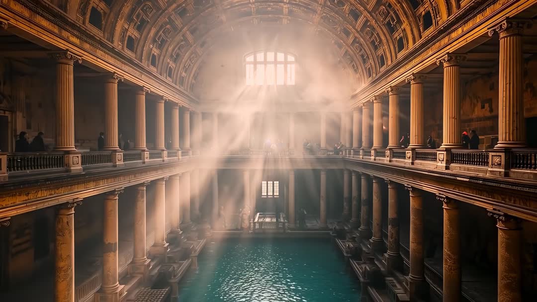 AI Generated Image. Sunlight streaming through high arched window and flooding neoclassical pool with turquoise glow, casting dramatic rays across marble colonnades and frescoed vaults. Visitors walking upper gallery wearing coats, soft haze catching light and enhancing cinematic atmosphere. Composition emphasizing symmetry, warm golden tones, and deep contrast between light and shadow. Ideal for use in travel videos, architectural documentaries, spa and wellness commercials, heritage tourism promos, and cinematic openers. Visuals working well as hero background for websites, social media clips, editorial spreads, and exhibition projections. Color grading suggestion: preserve warm highlights and teal midtones to emphasize turquoise water and classical surfaces.