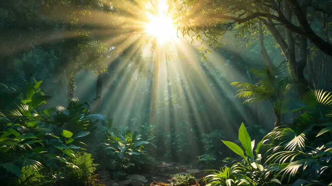 - Sunlight streaming through rainforest canopy at dawn, misty rays illuminating forest trail
