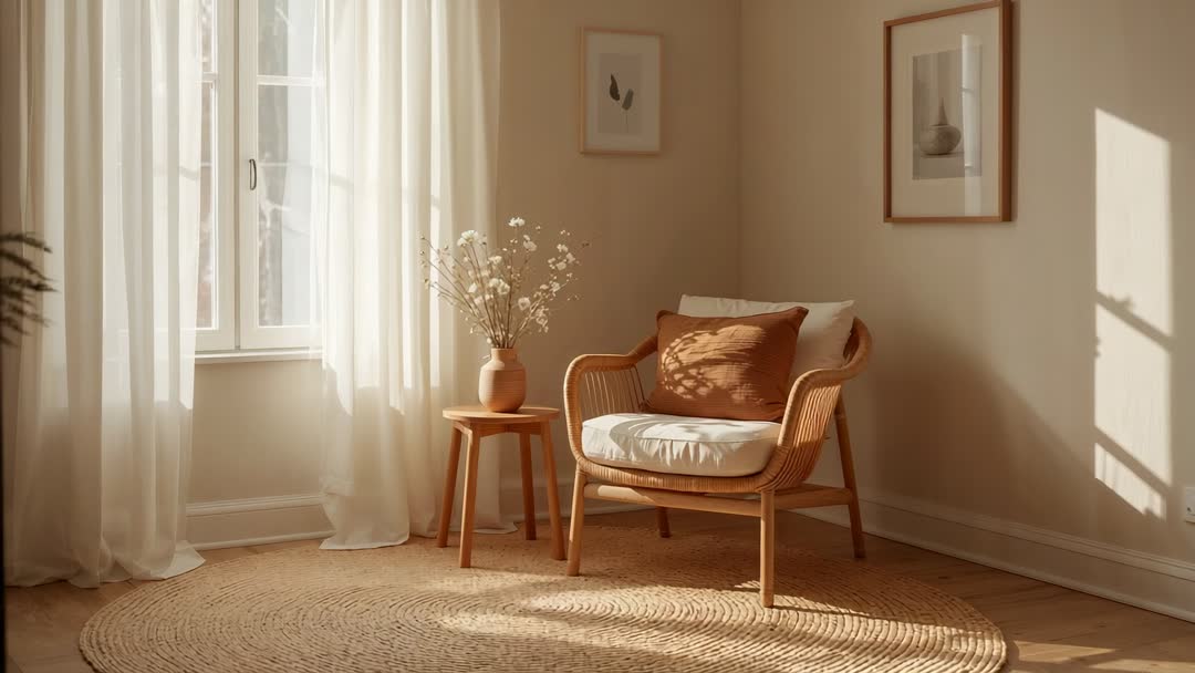 AI Generated Image. Showing sunlight streaming through sheer curtains and casting soft, shifting shadows across cozy corner featuring rattan chair with rust-colored cushion and linen seat pad. Camera panning slowly from window to chair, lingering on texture of jute rug, wooden floor, and ceramic vase with dried stems. Scene conveying warm, tranquil mood ideal for wellness content, interior design promos, real estate staging, product showcase, and lifestyle social media reels. Useful for hero backgrounds, looped ambient clips, calming B-roll, website banners, catalog headers, and meditation or relaxation videos. Color palette matching warm neutrals and terracotta tones, easy to grade for brand cohesion. Suggested durations: 6-30 seconds for social reels, 30-60 seconds for banners and ad spots. Include optional crop variations: vertical for stories, horizontal for hero banners, square for feeds. Licensing ready for commercial use.