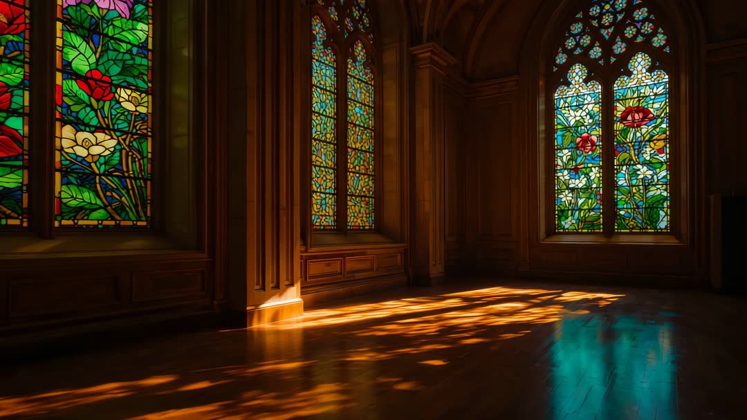 AI Generated Image. Filmed in a serene chapel, radiant sunlight passes through vibrant stained-glass windows, casting intricate floral reflections on polished wooden floors. This evocative video captures a tranquil ambiance ideal for projects involving spirituality, quiet reflection, or historic architecture. It is well-suited for documentaries, informational videos, or artistic projects exploring light and color interplay.