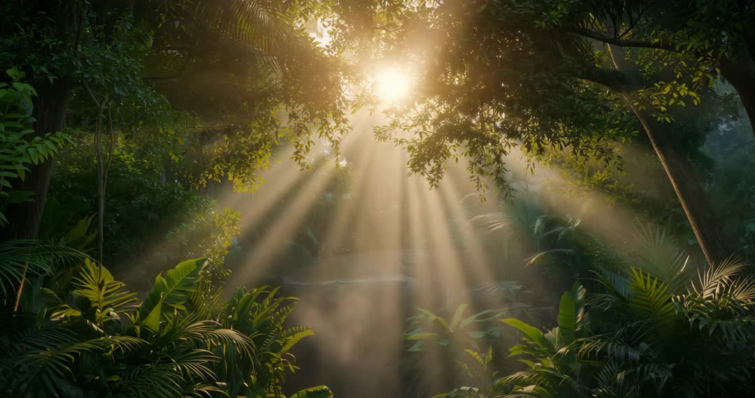 - Sunlight Streams Through Tropical Canopy Illuminating Misty Pool