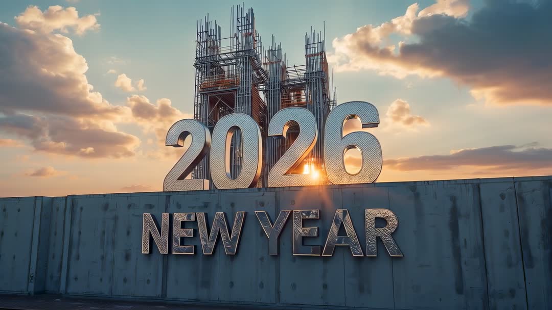 AI Generated Video. Time-lapse style video showing chrome 2026 numerals rising behind concrete wall at sunrise, scaffolding and exposed rebar catching warm sun flare. Metallic numerals reflecting sky tones and casting long shadows across weathered concrete surface. Camera pulling back slowly, revealing industrial rooftop and skyline silhouettes while sun glare peeking through numeral cavities. Working well for New Year campaigns, countdown animations, construction industry promotions, urban renewal storytelling, and social media hero banners. Suitable for website hero loops, broadcast openers, event intros, corporate forecasts, and festive signage. Recommending warm color grading, slow dolly or crane movement, subtle lens flare, and cinematic soundbed for dramatic reveal.