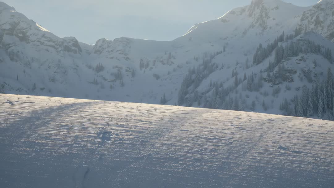 AI Generated Video. Footage showing sunlit alpine snowfield with wind-blown tracks and rippled frost texture, backed by conifer-covered mountain valley and distant snowy peaks. Wide-angle composition capturing soft morning light, long shadow lines and subtle horizon glow. Texture-focused foreground offering close-up style cutaways and slow-motion loop options. Use cases including opening sequences for winter travel films, promotional reels for ski resorts or backcountry tours, seasonal marketing banners, relaxing background for wellness or nature channels, and B-roll for documentaries or commercial spots. Post-production suggestions including using slow pan or subtle zoom for gentle motion, adding ambient soundtrack or soft piano, color grading for cool blue tones or warm sunrise highlights, and leaving lower-third negative space for titles or logos.