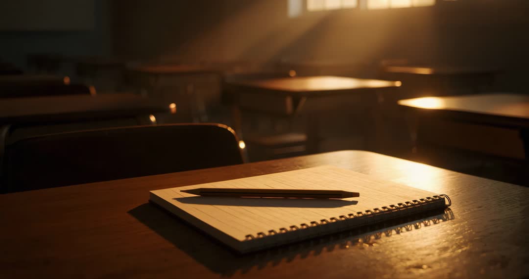 AI Generated Image. This video frame portrays a quiet classroom filled with warm, golden sunlight streaming over a wooden desk. A spiral-bound notebook accompanied by a pencil rests on the desk, emphasizing themes of academia and introspection. The scene captures the essence of simplicity and peace, ideal for representing calm study environments, educational themes, or artistic backdrops involving sunlit interiors. Perfect for educational materials, advertisements, or mood-setting content in videos related to learning or creativity.