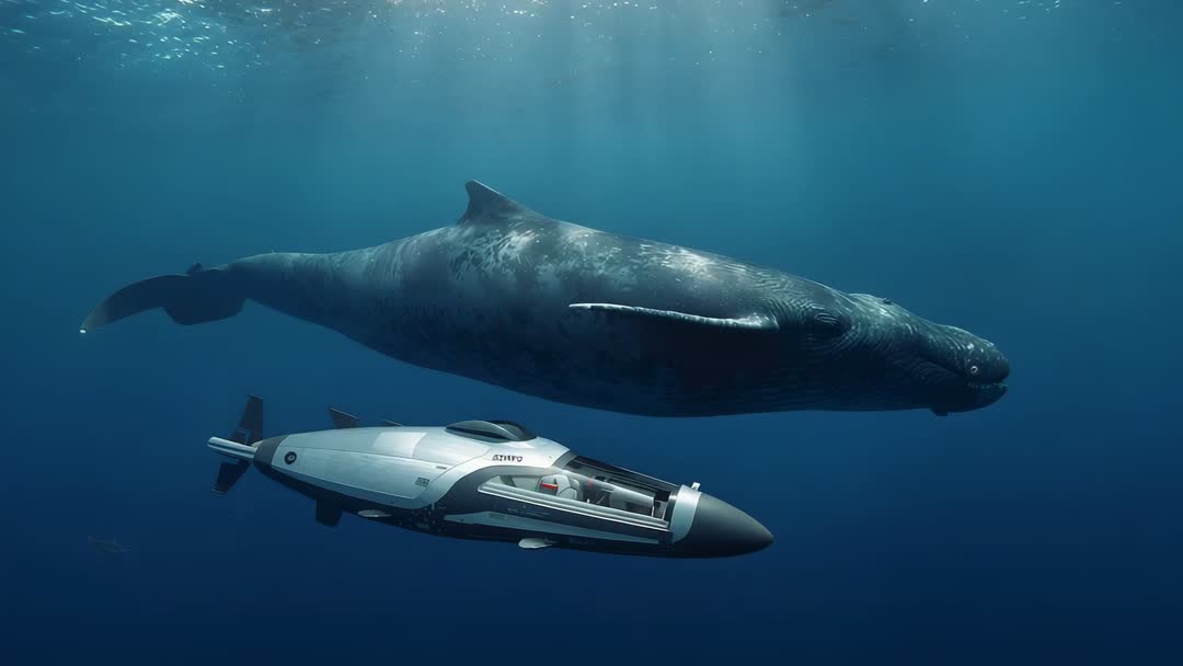 - Sunlit Deep Dive: Futuristic Submersible Tracking Giant Whale Through Open Ocean Depths