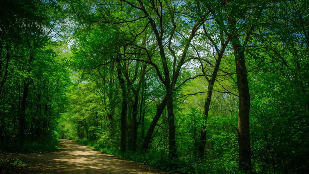 AI Generated Image. Video showing sunlit forest trail winding through dense green canopy, dappled light dancing across dirt path and creating soft moving shadows. Camera moving slowly forward along trail, revealing depth and framing tall trees and lush undergrowth. Color palette featuring rich greens and warm earth tones, mood calming and inviting for viewers. Working well as background footage for nature documentaries, travel promos, hiking and outdoor lifestyle content, mindfulness and meditation apps, website hero banners, social media reels, television spots, and advertising. Supporting slow pans, gentle zooms, and loop-friendly edits for ambient sequences or transitions. Providing versatile B-roll for environmental campaigns, tourism promotions, wellness projects, and desktop or mobile wallpapers. Licensing available for commercial and editorial use.