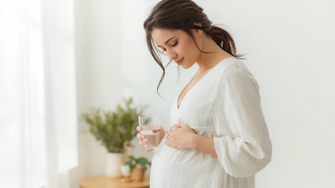 AI Generated Video. Gentle sunlit clip showing pregnant woman gently cradling bump while sipping water by window. Soft neutral palette and calming composition creating intimate maternity moment. Footage working well for prenatal care campaigns, pregnancy wellness blogs, maternal health education, hydration and nutrition tips for expectant mothers, childbirth preparation classes, lifestyle content, social media reels, healthcare websites. Clip allowing overlay text and voiceover and leaving copy space on left for titles or logos. Offering calm pacing, closeup to mid shot framing, ambient natural light and soft focus for soothing mood.