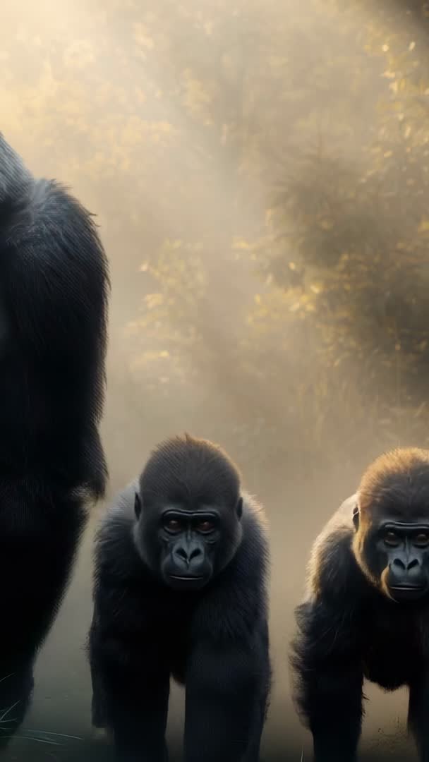 AI Generated Video. Vertical video capturing gorilla troop emerging from sunlit mist in jungle clearing, adult leading two younger members toward camera. Close-up framing emphasizing facial expressions and slow purposeful movement, warm golden light filtering through haze. Cinematic pacing with shallow depth of field, offering dramatic portrait of social dynamics and family bonds. Usage suggestions: - Ideal for documentary opener, nature series intro, wildlife short - Supporting conservation campaign, fundraising, wildlife awareness content - Optimized for social vertical platforms such as Instagram Reels, TikTok, Snapchat Spotlight - Working as background footage for environmental education, museum exhibit, or digital signage - Powering commercial storytelling for outdoor brand spot, travel promotion, nonprofit campaign Technical notes: - Vertical 9:16 format, cinematic lighting, soft mist providing space for text overlay at top area - High contrast between dark fur and warm backlight, mid to long shot composition - Editing tips: applying gentle warm color grade, adding slight slow motion for heightened drama, using ambient forest audio or subtle music bed