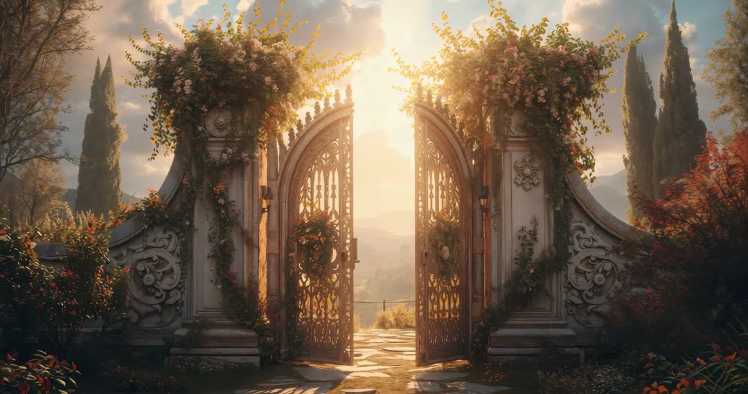 - Sunlit Ornate Garden Gate with Rustic Charm