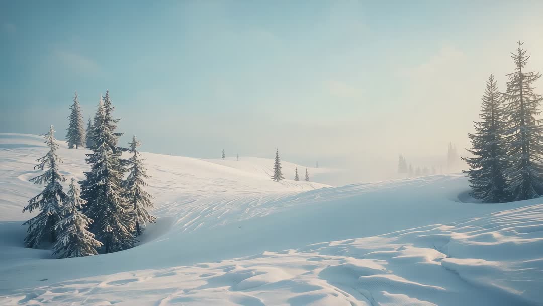 AI Generated Image. Camera gracefully pans over vast winter hills, enveloped in crisp white snow. Fir trees stand scattered across the terrain, each outlined against the faint glow of morning light. Sunlight breaks the pastel hues of the morning sky, encapsulating a scene of true winter serenity. Suitable for use in projects highlighting nature's tranquility, seasonal themes, or scenes depicting harmonious winter mornings.