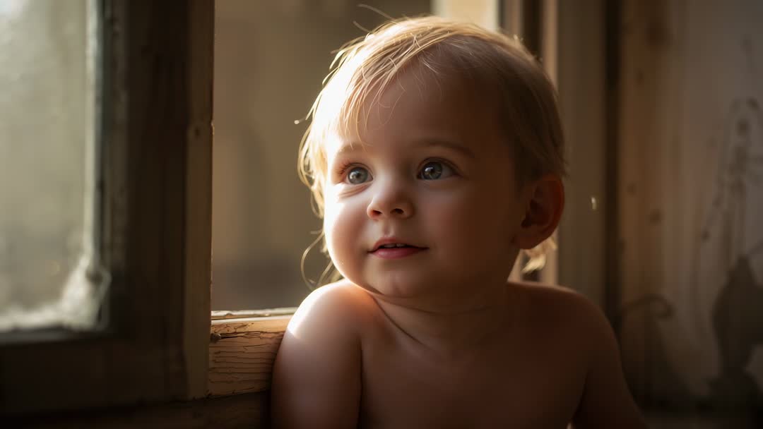 AI Generated Image. Clip capturing toddler leaning at wooden window, bathed in warm golden light while watching dust motes drifting in sunbeam. Close-up framing highlighting curious expression, backlit hair rim, and soft skin tones. Natural warm palette creating nostalgic, comforting mood ideal for family lifestyle, parenting, baby care, home interior storytelling, and early childhood content. Useful as B-roll, opening scene, social media reel, commercial spot, website hero, or educational video about child development. Recommend pairing with soft instrumental music, gentle ambient room sound, and slow-motion grading for cinematic feel. Footage supporting themes of curiosity, innocence, home warmth, and quiet everyday moments.