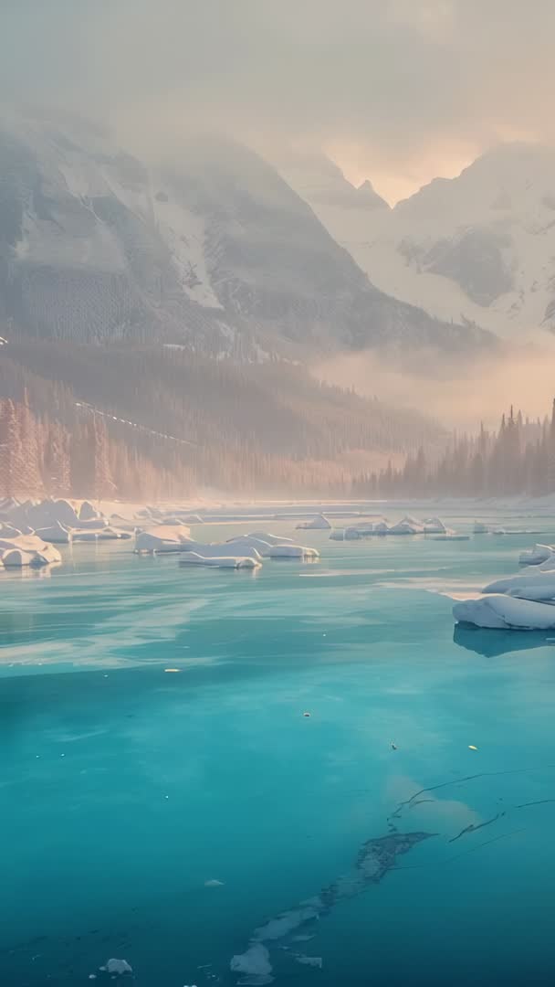 AI Generated Image. Showing sunlit turquoise lake with shifting ice floes and lifting mist along alpine shoreline, framed by snowcapped peaks and distant conifer forest. Capturing slow cinematic motion suiting vertical social platforms such as Instagram Reels, TikTok, Snapchat, and mobile ads. Providing tranquil background for travel promos, nature documentaries, meditation apps, seasonal greeting reels, and environmental campaigns. Highlighting color contrast between warm dawn glow and cool turquoise water, enabling vibrant color grade and slow zoom or pan edits. Working well as looping B-roll, title opener, smartphone wallpaper, or hero clip for landscape and adventure content. Leaving vertical space for captions and lower third text within misty sky area, and offering strong foreground interest with floating ice shapes for layered compositions.