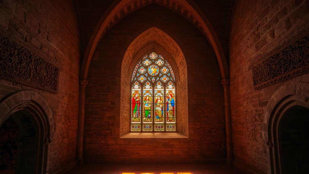 - Sunlit Vibrant Stained Glass in Tranquil Church for Reflective Journey