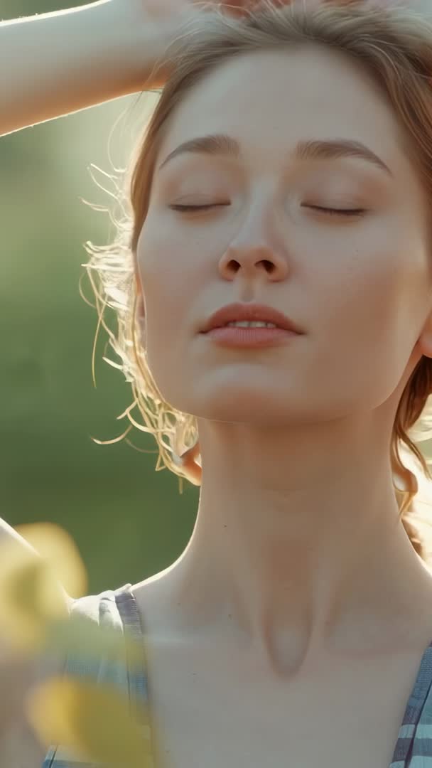 AI Generated Image. Vertical video showing sunlit young woman closing eyes while lowering arms in meadow, breathing slowly and finding calm. Closeup framing highlighting natural skin texture, soft sunlight backlighting hair, gentle breeze creating subtle movement. Mood evoking mindfulness, inner peace and moment of quiet reflection. Ideal for wellness campaigns, meditation apps, spa landing pages, social media vertical stories, guided breathing videos, mindful living blogs, yoga or retreat promotions. Works well as looped background, 15–30 second social clip, hero mobile banner, calming intro for mental health workshops or breathing classes. Recommended color grading using warm tones, slow crossfades and minimal music or ambient nature sound for maximum serenity.
