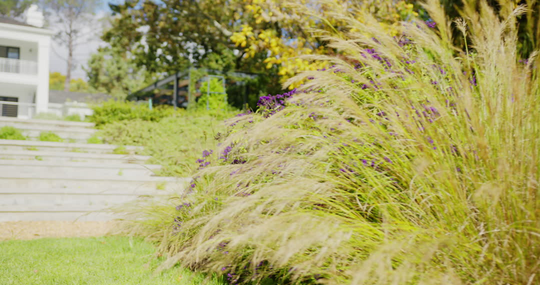 A serene garden scene featuring tall grasses swaying gently in the breeze, with steps leading up to a modern home in the background, bathed in sunlight. Complementing the luscious greenery are trees and shrubs creating a peaceful and inviting environment. Perfect for use in articles or designs featuring nature-inspired home landscapes and environments focused on outdoor relaxation and lifestyle.
