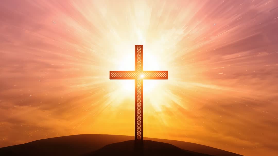 AI Generated Image. Scene showing ornate cross standing on low hill while sunrise backlighting creates dramatic starburst and golden halo. Sun rays radiating outward, particles drifting, lattice detail glowing through bright backlight and creating strong silhouette contrast. Conveying themes of hope, renewal, resurrection, devotion and peaceful reflection. Working well for church services, sermon slides, Easter promotions, memorial tributes, devotional videos, inspirational social posts, website banners, printed posters and book covers. Editing suggestions include using slow motion, warm color grading, subtle ambient music, soft vignette and title overlays; cropping for portrait or widescreen and looping for background playback. Working best in 4K video and wide cinematic aspect ratios for high-resolution display and broadcast use.