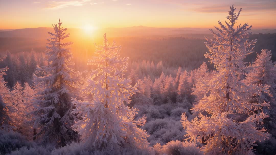 AI Generated Video. Clip showing sunrise bathing frosted firs on ridge while drone pushing forward through pastel-lit hoarfrosted boreal forest. Warm golden-hour light backlighting frost-covered branches and mist, creating soft pink and orange glow across snow-laden canopy and distant hills fading into haze. Composition offering wide panoramic framing with gentle forward motion and subtle parallax, supporting slow cinematic reveal and ambient background sequences. Ideal for nature films, travel and tourism promos, winter holiday campaigns, environmental storytelling, wellness and meditation videos, website hero headers, social media reels, broadcast B-roll, and stock footage libraries. Technical notes: aerial drone footage, stabilized motion, compatible with 4K delivery, color-graded warm tones, adaptable for slow motion or time-lapse conversion. Creative suggestions: add gentle piano or ambient soundtrack, overlay inspirational titles, use as transition into sunrise sequences, or pair with voiceover about conservation and winter landscapes.
