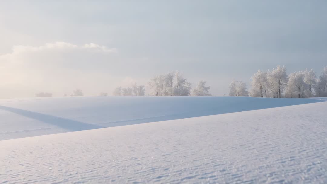 AI Generated Video. Clip capturing soft sunrise light casting long diagonal shadow across expansive snow-covered field with frosted trees lining horizon under pale sky. Scene conveying calm, cold atmosphere with delicate frost detail and subtle fog. Serving as establishing shot for winter travel video, seasonal greeting, nature documentary, weather report, real estate winter promo, agricultural winter update. Pairing with ambient piano or gentle synth pad to create contemplative mood. Designing slow pan or gentle drone reveal to emphasize scale and depth. Providing ample negative space on lower and center areas for title, logo, or text overlay. Editing into social media reels, website hero banners, broadcast idents, or stock B-roll packs. Preparing loopable short clip by matching start and end frames for seamless background.