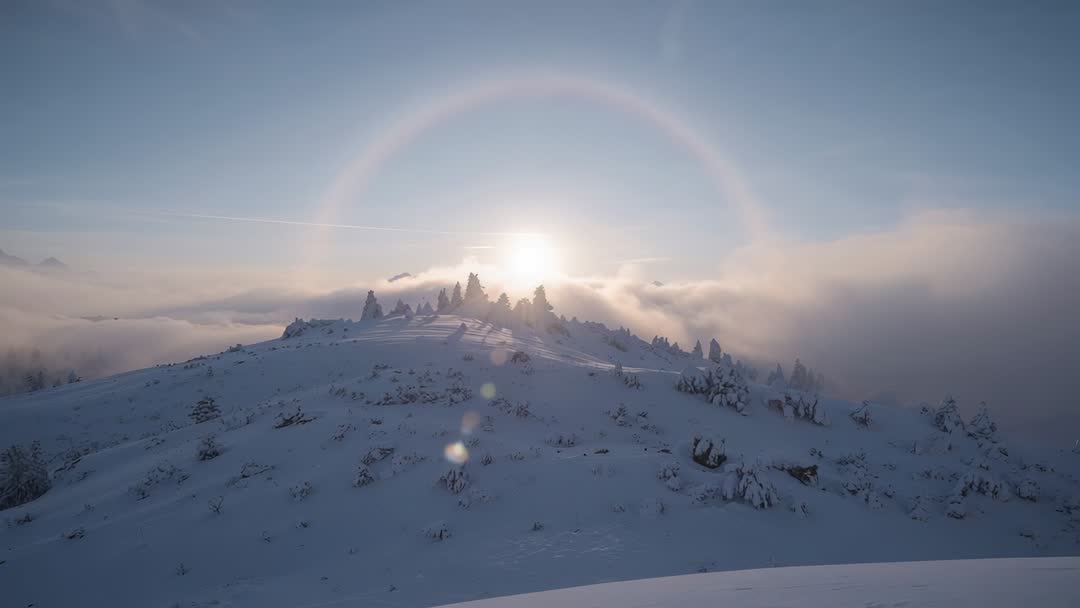 - Sunrise Creating 22° Halo Over Snowy Alpine Ridge While Fog Rolls Across Peaks