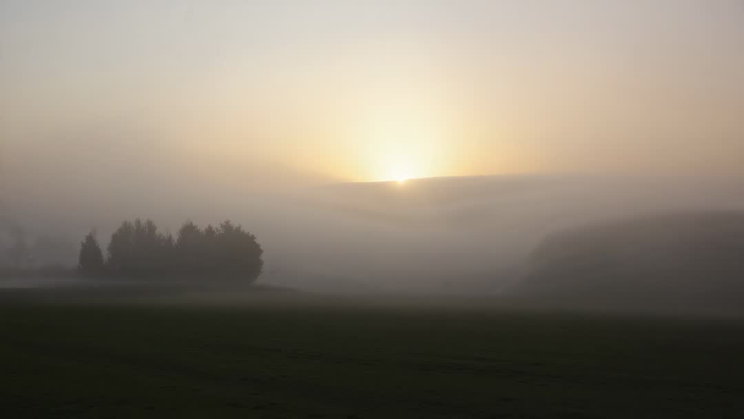 - Sunrise emerging through morning mist over rural field; silhouetted trees, tranquil dawn timelapse
