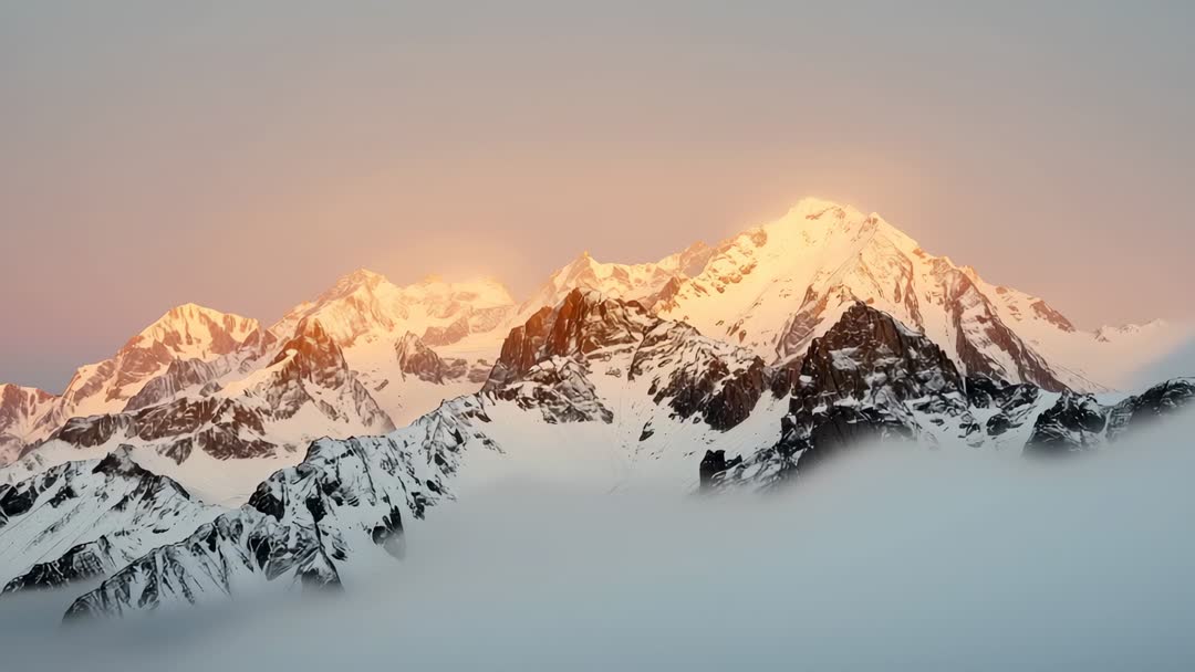 AI Generated Video. Snowy mountain peaks brilliantly illuminated by the gentle light of sunrise, emerging through a misty horizon. This tranquil and awe-inspiring scene of alpine beauty evokes a sense of serenity and majesty, ideal for travel brochures, blog posts about nature, or environmental campaigns illustrating the beauty of untouched wilderness.