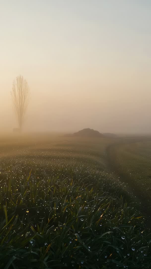 AI Generated Video. Capturing vertical dawn footage showing sunlight lifting fog over dew-covered grass and lone poplar tree. Featuring soft golden backlight, sparkling dew droplets, low contrast mist, and gentle leading lines from tire tracks. Suitable for background footage in meditation, wellness, nature documentaries, travel promos, web banners, social media reels, cinematic intros. Working well for illustrating morning routines, farm life, climate themes, seasonal change, slow living concepts. Providing ample space for text overlay and titles in upper frame due to calm sky area. Recommending slow pan or fade transitions to emphasize tranquil mood and reveal dew detail. Using 4K or high-resolution export for large-format displays and background loop playback.