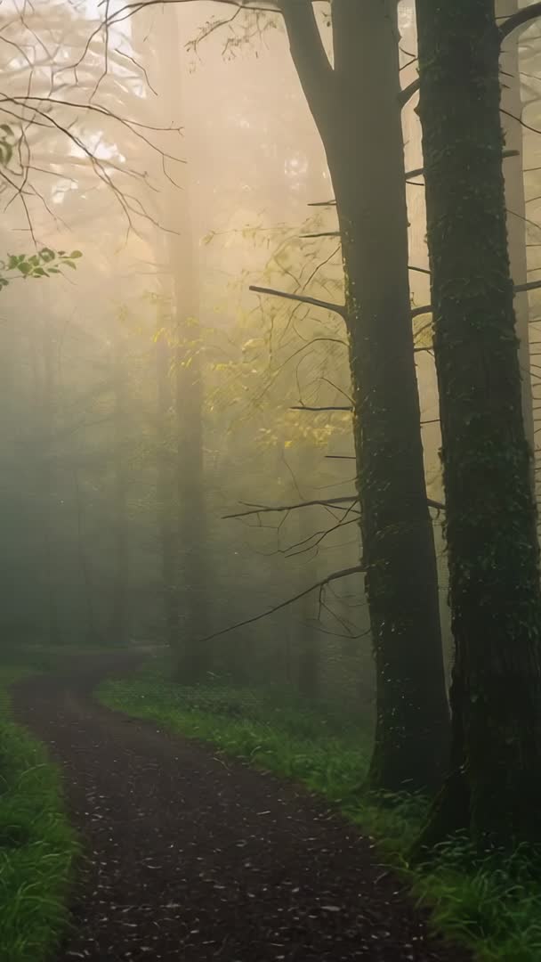 AI Generated Video. Vertical footage showing sunrise light breaking through low fog along curving forest trail, highlighting twin mossy trunks in foreground. Soft golden rays filtering through canopy, mist drifting between trunks, path disappearing into atmospheric distance. Mood evoking calm, mystery, and quiet exploration, with rich green tones and damp textures. Ideal for nature documentary, meditation or wellness content, cinematic openers, background for voiceover about exploration, hiking, mindfulness, environmental conservation. Providing plenty of negative space and vertical composition suited for mobile reels, social stories, and website hero headers. Suggested edits: slow motion, warm color grade, gentle music underscore, subtle vignette for depth.