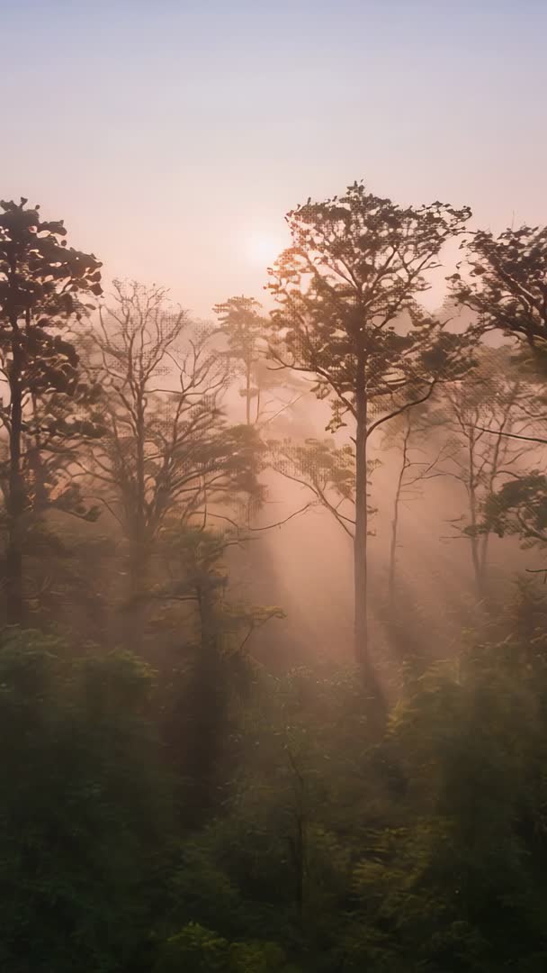 AI Generated Video. Vertical drone footage capturing sunrise light streaming through misty forest canopy. Tall trees casting sun rays and creating dramatic silhouettes against soft pastel sky. Morning fog layering forest and diffusing warm golden light, revealing foliage detail and depth. Ideal for use in nature documentaries, travel commercials, eco tourism promos, meditation and wellness videos, background B-roll for environmental storytelling. Useful as opening sequence, scene transition, title background, vertical social media ad, app splash screen, or ambient loop for signage. Color grading friendly for warm cinematic looks, slow motion friendly for emphasizing atmosphere and mood. Suitable for commercial and editorial licensing.