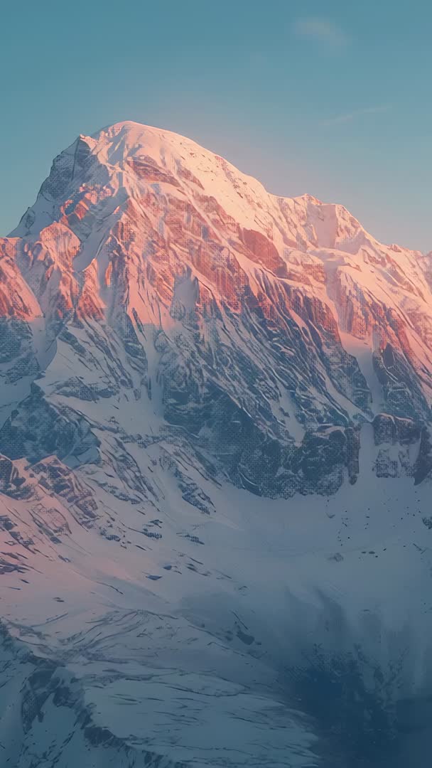 AI Generated Image. Vertical video showing sunrise lighting snowy alpine peak, casting shadows across glacier-carved snowfields and sculpting ridgelines with warm pink light. Soft pastel sky providing calm backdrop while daylight slowly revealing textured ice faces. Composition emphasizing vertical height and sense of scale, creating cinematic minimalist mood. Use for travel and tourism promotion, mountain resort advertising, adventure and outdoor brand campaigns, environmental and climate storytelling, meditation and relaxation content, mobile wallpapers and social media reels. Pair with ambient soundtrack and slow-motion edit for dramatic opening sequence or use as hero video on landing pages. Color grading and crop-friendly vertical frame making content ready for Instagram Stories, Reels, TikTok, and mobile-first projects.