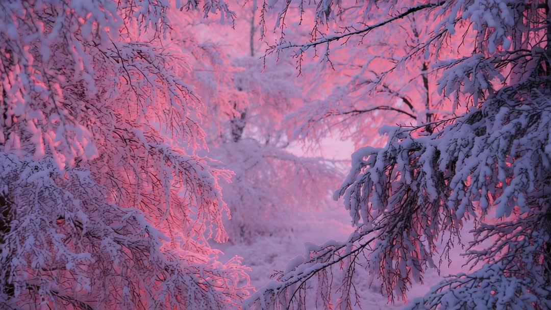 AI Generated Video. Slow panning video clip capturing snow-laden birch and fir branches glowing under pink sunrise backlight. Foreground branches framing soft-focused woodland, creating strong depth and layered composition. Color palette featuring pastel pink, lavender and cool blue, producing dreamy cinematic mood. Ideal uses include background for seasonal marketing, holiday greeting screens, wellness and meditation videos, travel and nature promos, website hero banners, social media reels, environmental storytelling and title sequences. Clip working well for color grading experiments, slow-motion edits, looped ambient backgrounds, aerial-to-forest transitions and mood-driven commercials. Technical suggestions: apply gentle crossfade, pair with ambient piano or synth bed, maintain slow pan speed for calming effect, crop for vertical formats for stories and reels, extend loop for seamless backgrounds. Licensing ideas: use for editorial features on winter travel, lifestyle blogs, spa and wellness campaigns, greeting card animations and cinematic trailers.