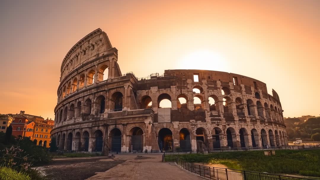 AI Generated Image. Showing Colosseum at sunrise with warm golden light shifting from backlit silhouette to frontal illumination. Capturing wide-angle pan across multi-tiered amphitheater, showcasing arches, travertine stonework, and surrounding piazza under soft orange sky. Delivering cinematic mood and high-contrast tones ideal for travel, history, architecture, and cultural storytelling. Suggesting uses: hero video for travel websites, promotional reels for tour operators, social media shorts and reels, documentary openings on Roman history, background loops for hospitality lobbies, editorial video for culture magazines. Including room for text overlays on sky area and foreground, and compatible with color grading for vintage or modern cinematic looks. Providing warm palette suitable for seasonal marketing, itinerary brochures, and educational content on ancient landmarks.