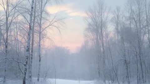 AI Generated Video. Frame capturing sunrise shifting light across snow-covered birch clearing, mist veiling distant treeline and pastel dawn sky. Scene conveying calm cold atmosphere with delicate frost on branches and soft pink-blue color palette. Footage working well for background loops, relaxation videos, seasonal campaigns, travel promos, nature documentaries, meditation apps, holiday greeting content. Usage ideas: extending clip with slow panning or gentle timelapse, adding ambient piano or wind soundscape, applying subtle color grade to enhance pastel hues or boosting contrast for cinematic winter drama. Frame sourced from AI-generated footage, offering clear labeling for projects requiring AI-derived media.