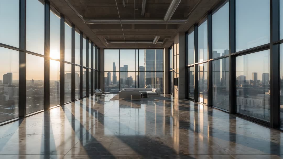 AI Generated Image. Video showing sunrise light sliding across expansive penthouse loft with floor-to-ceiling glass and sweeping city skyline. Camera moving closer revealing minimalist sofa and reflective polished floor, creating cinematic depth and warm morning glow. Composition highlighting contrast between raw concrete ceiling and sleek marble surfaces, emphasizing modern urban luxury and spacious open plan. Footage suiting real estate virtual tours, architecture and interior design reels, luxury lifestyle promos, hotel or apartment marketing, corporate b-roll, and cinematic establishing shots. Clip providing generous negative space for overlay text, logos, lower-thirds, or product placement; color grading and ambient audio beds adding cinematic mood.