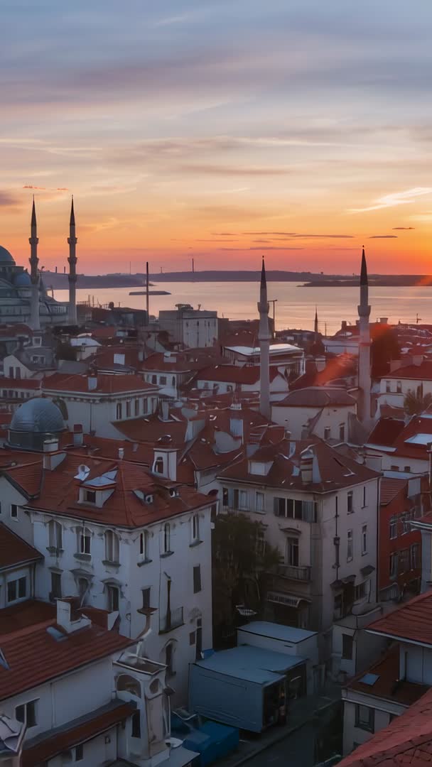 AI Generated Image. Clip showing slender minarets rising above dense cluster of red-tiled rooftops while sun descending over distant sea, casting warm golden light across domes and facades. Vertical aerial framing emphasizing height of spires and depth of narrow streets, with expansive sky providing clear area for title overlays and captions. Slow, cinematic motion creating peaceful evening mood and strong contrast between sunlit ridges and long shadows on terracotta tiles. Ideal for travel and tourism reels, cultural documentary openers, cityscape establishing shots, hospitality and real estate promos, social media vertical ads, and website hero backgrounds. Recommend slow playback or gentle ramping, subtle warm color grade to enhance sunset tones, and room for lower-third graphics without obscuring architectural details.