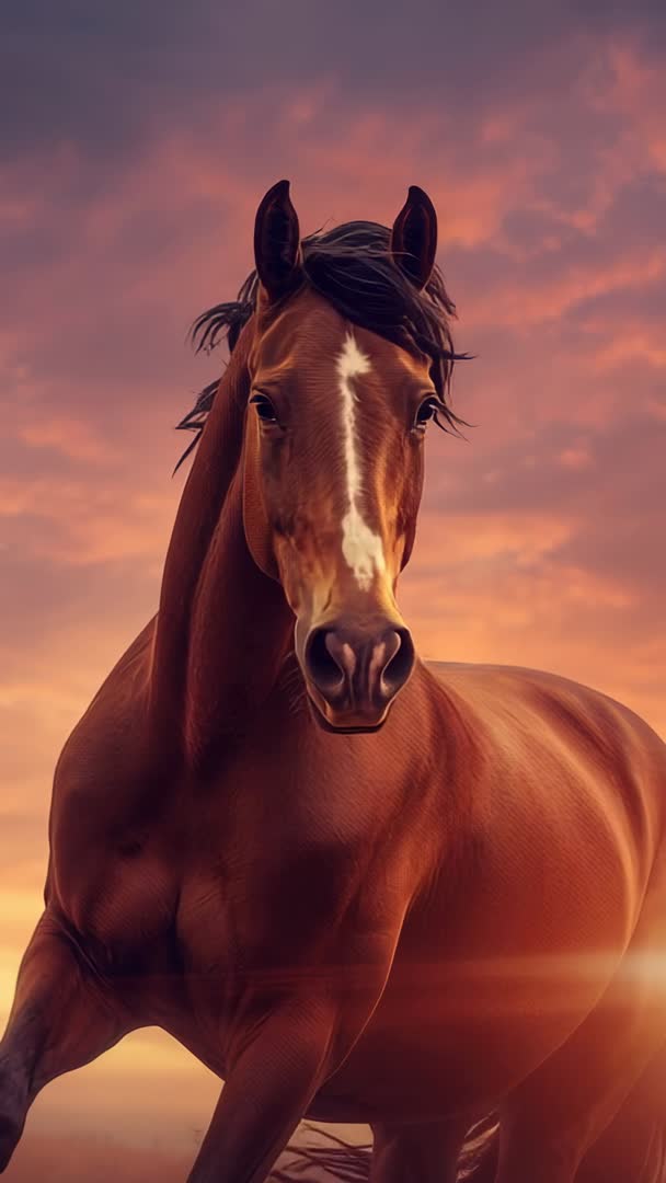 AI Generated Image. Vertical video showcasing bay chestnut horse turning toward camera during golden hour, foreleg lifting, mane flowing, white blaze standing out against dramatic sunset sky with warm lens flare. Ideal for equine advertising, ranch and farm promotions, veterinary and equestrian training material, social media reels, and cinematic openers. Using as hero clip for website banners, hero backgrounds for landing pages, broadcast spots, and lifestyle commercials. Editing-friendly composition with clean horizon, natural backlight, and cinematic color grading enabling color correction and slow-motion extracts. Suitable for frame extracts for posters, calendars, editorial features about horsemanship and outdoor lifestyle, and marketing campaigns emphasizing freedom, power, and natural beauty.