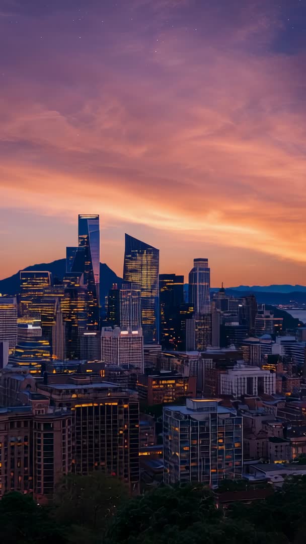 AI Generated Video. Vertical video showing sunset deepening over modern skyline, glass towers reflecting warm magenta and amber sky, city lights turning on from hillside lookout. Framing featuring highrise silhouettes, illuminated windows, distant water and mountain outlines. Ideal for background footage in vertical social ads, real estate and architecture promos, travel guides, urban lifestyle videos, title intros and event montages. Providing dramatic color palette for mobile wallpapers, website hero panels, app backgrounds and video transitions. Licensing suggestions: use as loopable ambient clip, overlay for text titles, or establishing shot for documentaries and corporate presentations.
