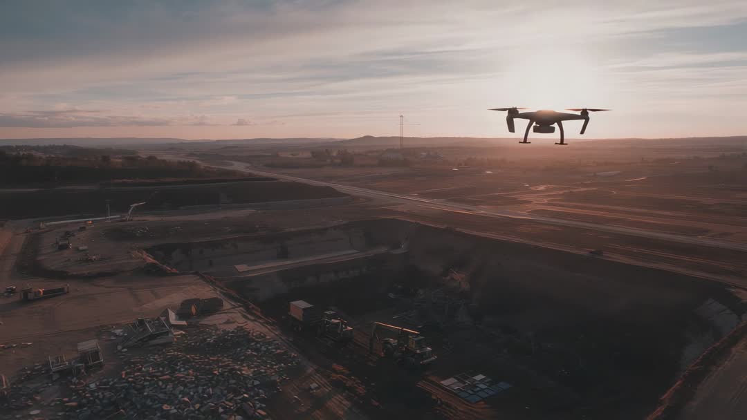 - Sunset drone surveying open-pit quarry, hovering over stockpiles and heavy machinery