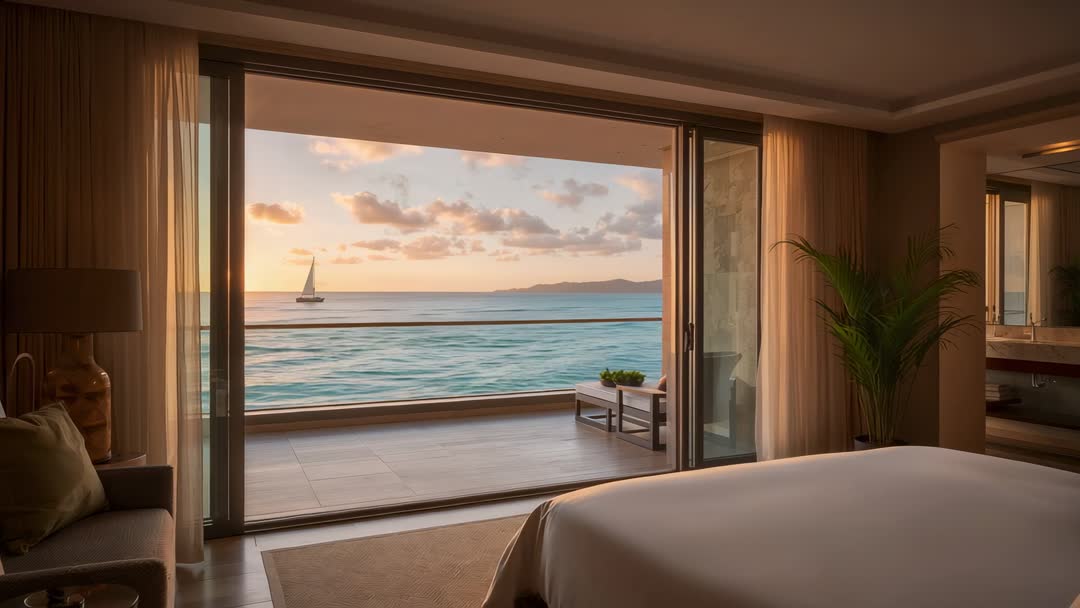 AI Generated Video. Oceanfront bedroom with sliding glass doors opening onto balcony at sunset, warm golden light flowing across bed and floor, sailboat gliding on horizon, distant island silhouette adding depth. Interior featuring modern king bed, cozy sofa, ceramic lamp, potted palm, wooden terrace furniture. Video footage working well for travel and hospitality promotion, resort marketing, hotel website hero reels, romantic getaway campaigns, real estate listings, lifestyle and wellness content. Usage suggestions: crop for widescreen hero banner; loop 10-20 seconds for ambient background; add gentle ocean sound for immersive experience; overlay bold call-to-action text on sky area; color grade warmer tones to enhance sunset mood.