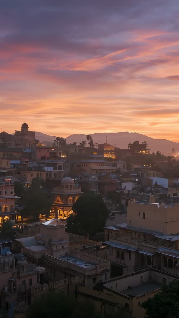 AI Generated Image. Vertical video showing sunset over historic cityscape, with domed turrets glowing against shifting cloud hues. Camera capturing warm golden-hour light spilling across rooftop terraces and narrow lanes, while distant hills forming soft silhouettes. Footage offering slow atmospheric pans or still holds for titles and overlays, with tall aspect ratio optimized for mobile platforms and vertical ads. Ideal for travel promotion, heritage tourism campaigns, cultural documentaries, hospitality marketing, social media reels, and background for text or voiceover. Color grading suggestion: enrich warm tones, boost magenta and lavender in sky for dramatic contrast. Soundtrack suggestion: ambient cinematic score with gentle percussion to enhance tranquil, evocative mood.