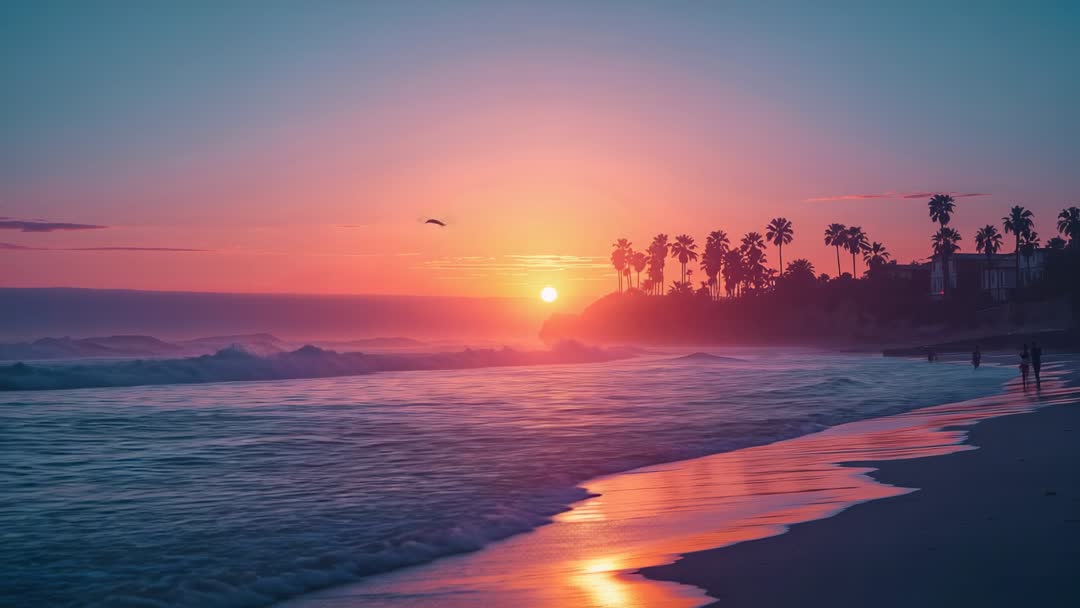 AI Generated Image. Featuring warm magenta and teal sunset tones, palm tree silhouettes, rolling waves, and reflective wet sand creating strong foreground leading lines. Showing gull flying over surf and couple walking along shoreline for scale and narrative. Evoking calm, romance, travel, and evening leisure mood. Serving as cinematic coastal b-roll for travel promos, hotel and resort ads, lifestyle commercials, website hero videos, social media reels, and editorial pieces. Working well as looping background, title card backdrop, desktop wallpaper, or ambient scene for lounge and wellness brand content. Supplying wide negative space for text overlays and lower-third graphics. Including natural motion of waves for seamless crossfade transitions and color grading flexibility.