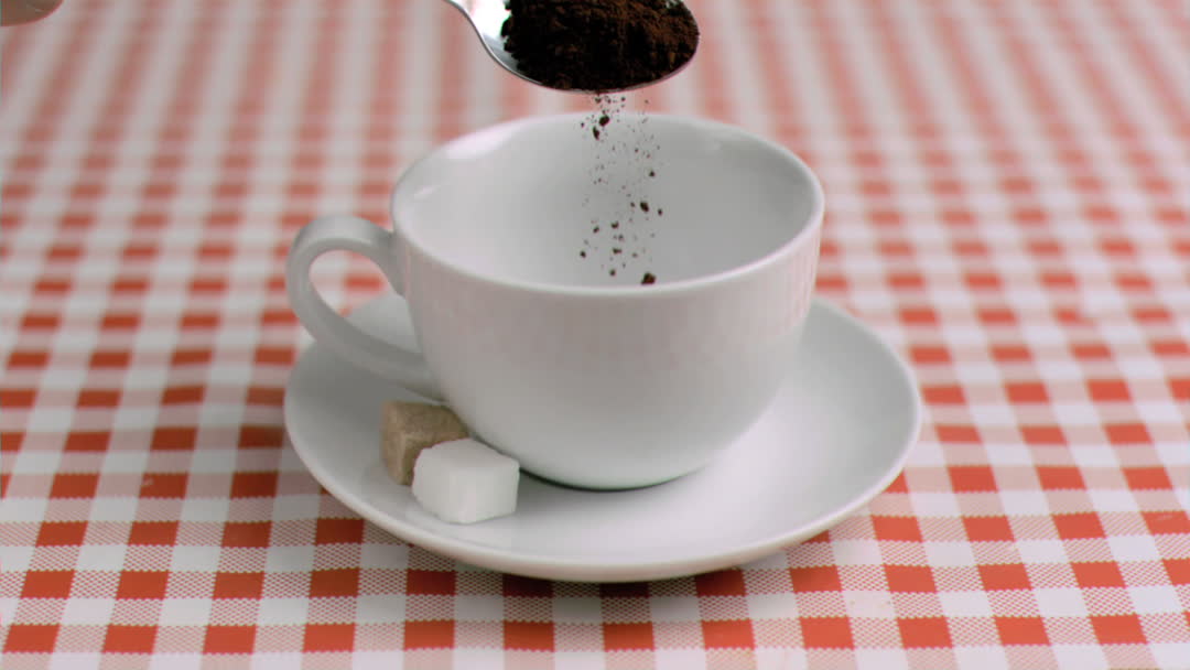 Ground coffee falls from a spoon into a clean white cup placed on a saucer on a red and white checkered fabric. Two sugar cubes rest beside the cup, suggesting preparation of a morning beverage. Suitable for use in kitchen or cafe-themed visuals, drink recipes, or marketing materials emphasizing the comfort and routine of breakfast time.