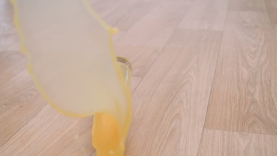 - Super Slow Motion Falling Orange Juice on Wooden Floor
